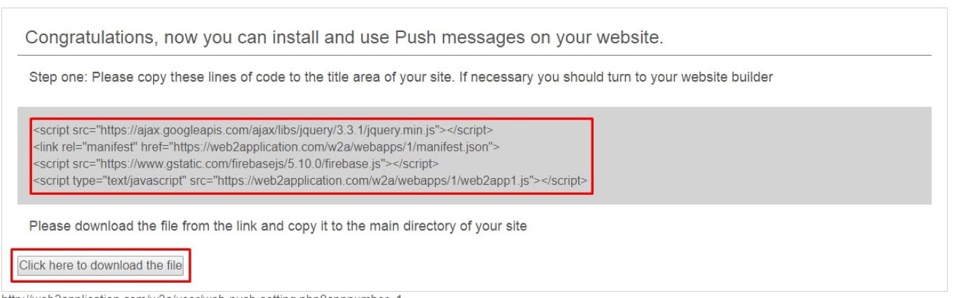 Dopo aver fatto clic, si aprirà una finestra con un codice che deve essere copiato nel vostro sistema all’indirizzo web2application.com