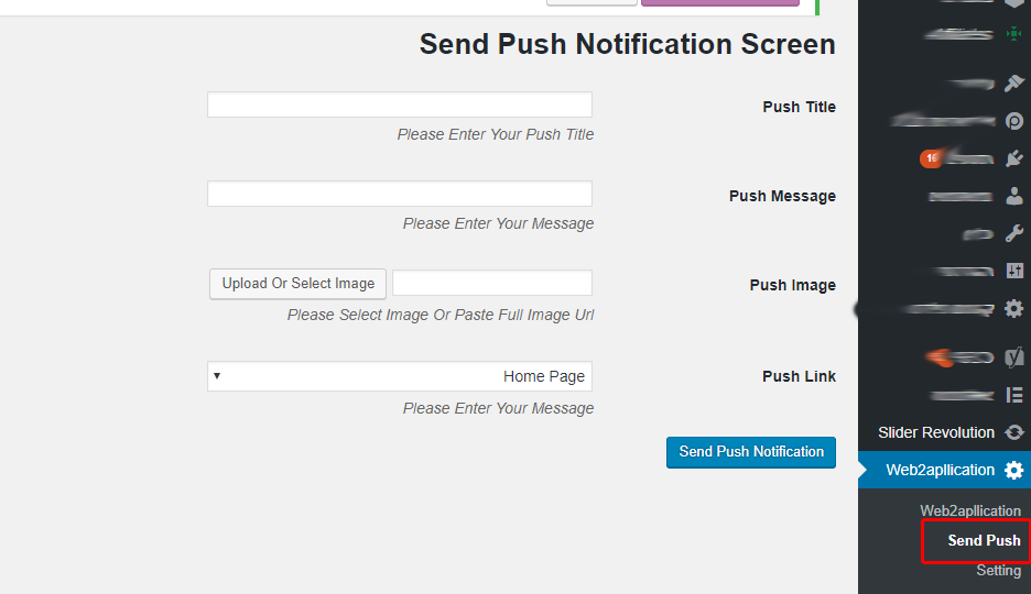 Las notificaciones push pueden enviarse a través de su interfaz de administración o directamente desde su sitio WordPress. Para enviar directamente desde tu sitio WordPress a las aplicaciones, necesitas instalar nuestro plug-in “web2application” desde el directorio de plug-ins y entonces podrás enviar los mensajes junto con imágenes desde la biblioteca multimedia del sitio y asociar el mensaje del post a una página o post específico del sitio.