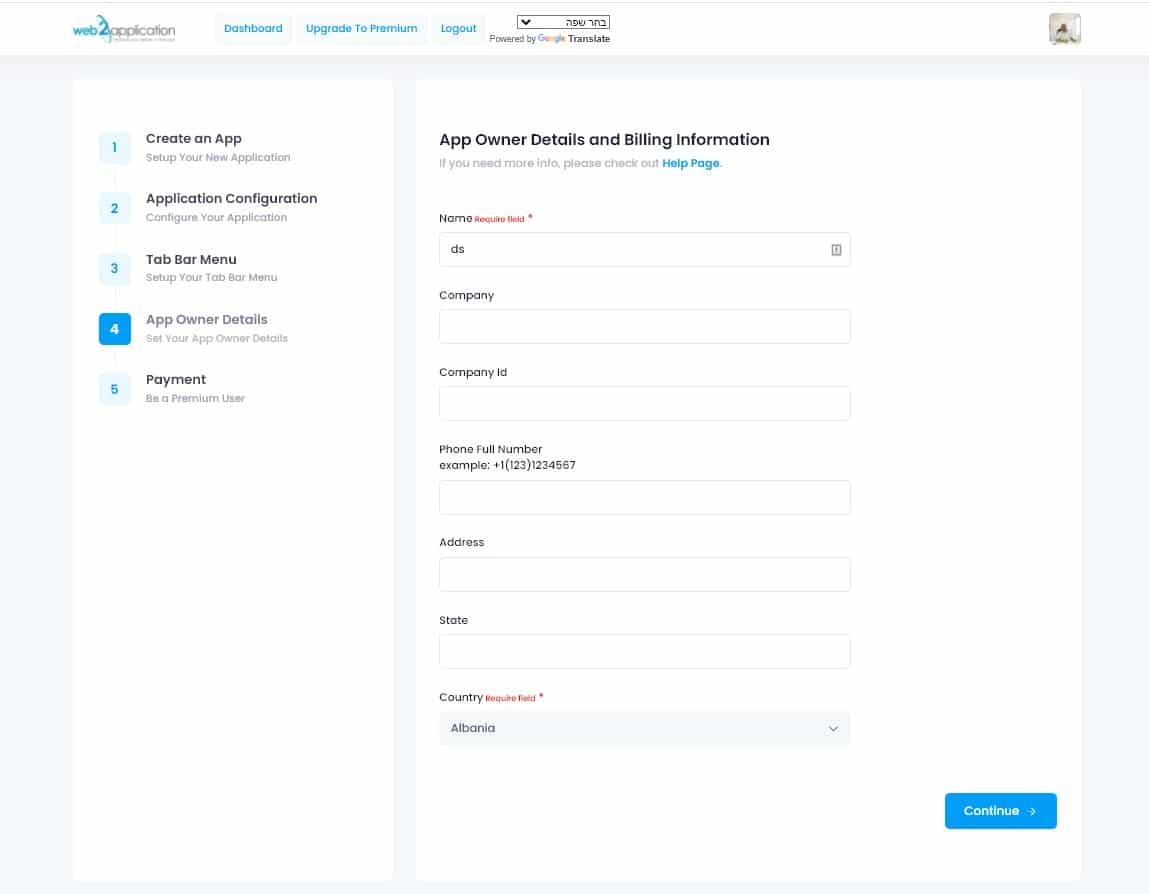 Quando terminar, clique em continuar e será redireccionado para a fase final, onde poderá selecionar se pretende ser um membro premium e nós ajudá-lo-emos a configurar a sua aplicação, ou ser um membro gratuito.