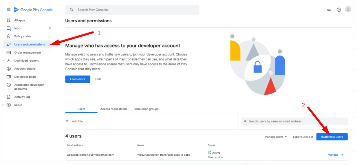 Entre na consola do Google Play, clique em definições e depois em utilizadores e permissões.