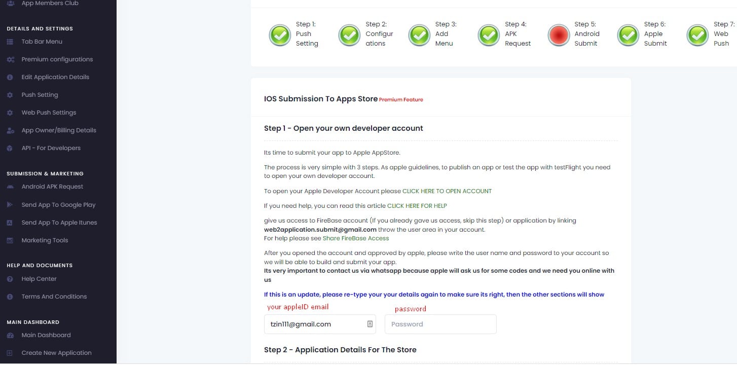 Depois de ter uma conta de programador da Apple(certifique-se de que a sua conta de programador é aprovada pela Apple), basta introduzir o painel de controlo da sua aplicação no nosso sistema e pedir-nos para carregar a aplicação na sua conta de programador.